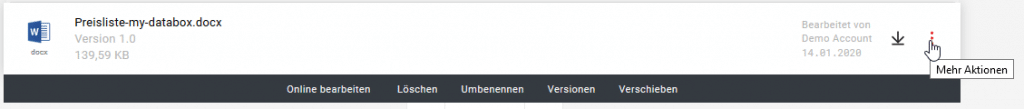 Neben der Versionsnummer ist der Ersteller des Dokuments, der Änderungszeitpunt sowie die Größe der Datei aufgeführt.